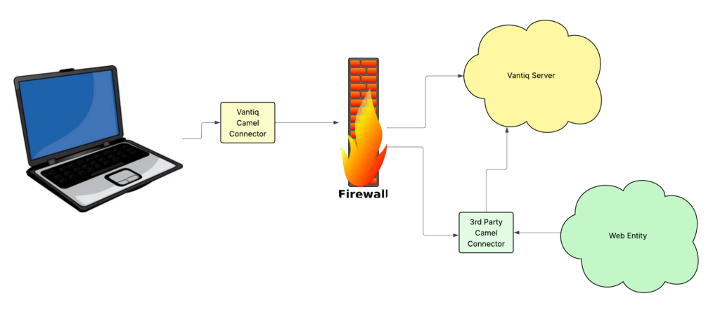 Vantiq integrates messages from other web-based entities using Camel as an Enterprise Extension. The Camel Connector uses the Camel Component to build the appropriate Apache Camel application, which runs locally to the user. The application, in turn, is directed to the 3rd party’s CamelConnector by configured routing.