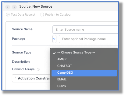 Well, now that you can create a CamelGEO source, let’s do that. I’m calling mine CamelGEO,