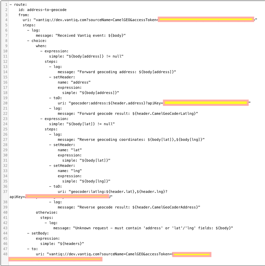 All we need to set is the camelRuntime.routesDocument with the name of the YAML file that defines the Geocoder Camel Component routes we’re going to use. The appName would have defaulted to camelConnectorApp. If I’d needed to add security information like a ClientId or access token, that would be added into other properties. (Again, see that README file.)